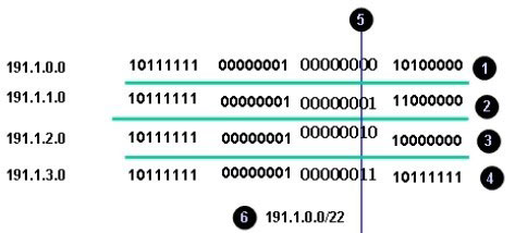 步骤3:⑥ 取出共同的部分,后面的位补“0”,这里是191.1.0.0。再数一数竖线左边的位数是22,得出汇总后的网络地址是191.1.1.0/22。同理可以得出去往R2的路由汇总条目是191.1.4.0/22,去往R4的路由汇总条目是191.1.8.0/22。