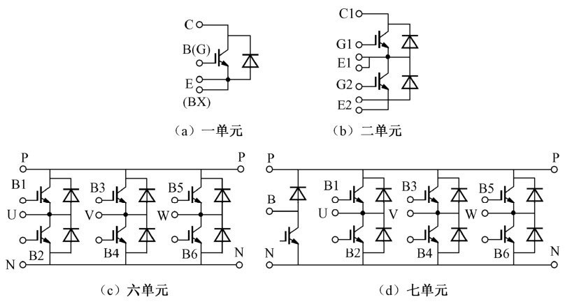 IGBT产品有多种形式,主要分为模块型和芯片型两大类。模块化结构有一单元(一个IGBT与一个续流二极管反向并联)、二单元、四单元、六单元及七单元,高压IGBT有模块、平板和片状IGBT元件。常用的IGBT模块内部结构如图1-9所示。