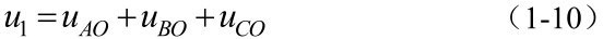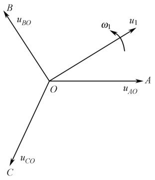 电压空间矢量是按电压所加绕组的空间位置来定义的。如图1-10所示,三相定子相电压uAO、uBO、uCO分别加在三相绕组上,它们的方向始终不变,而大小则随正弦规律做脉动式的变化,相位互差120°。其合成矢量u1是一个旋转空间矢量,以电源角频率旋转,即