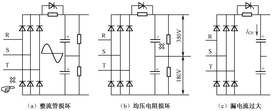 当整流桥中有一个整流管被击穿时,整流后的电压将出现交流成分,滤波电容器上出现反向电压,滤波电容器因此而损坏。