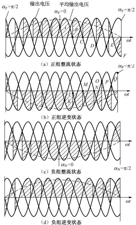 负组整流桥的输出电压波形如图1-28(c),(d)所示。当负组桥触发角αN<π/2时,负组桥处于整流状态,总的功率由电源输送给负载;当αN>π/2时,负组桥处于逆变状态,由负载向电源传送功率。