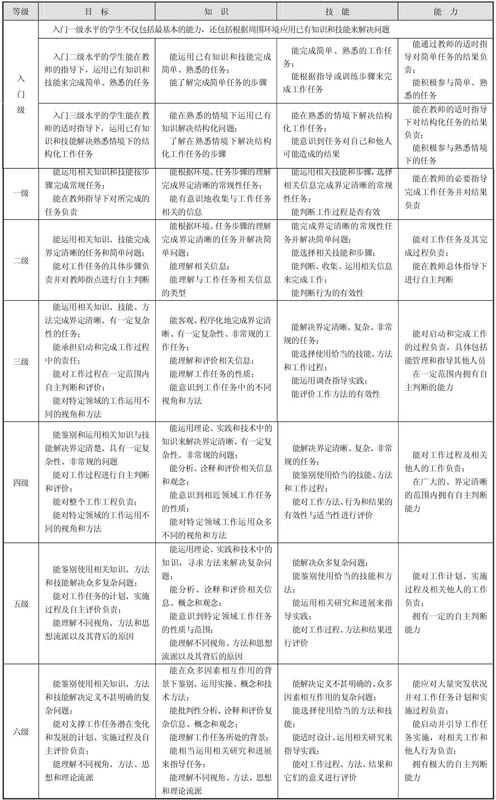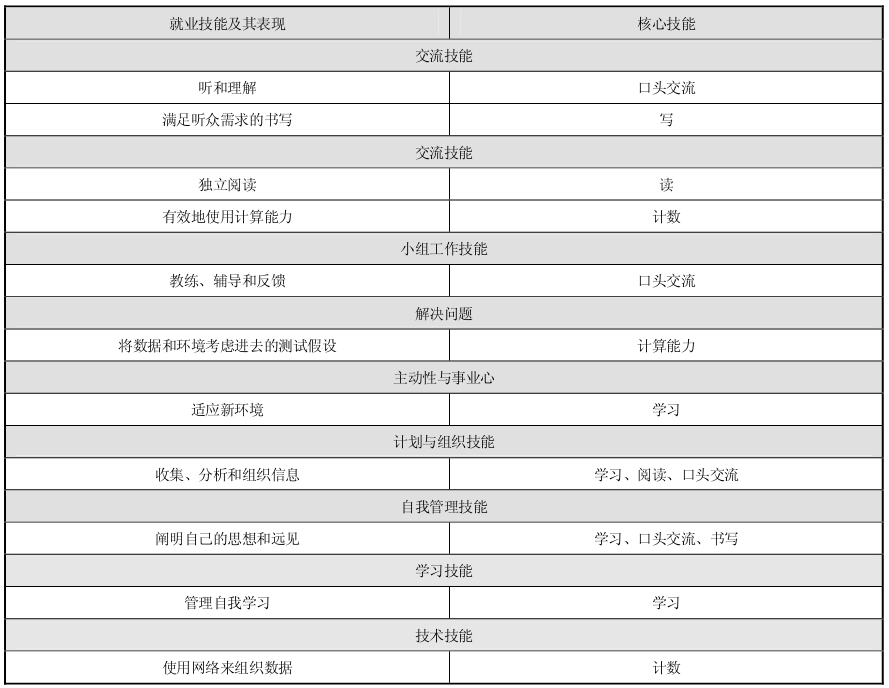 为提高个人的就业与发展能力,澳大利亚工商业协会(ACCI)和澳大利亚商务委员会(BCA)开发了就业技能框架内容,提出就业技能由交流、小组工作、解决问题、主动性与事业心、计划与组织、自我管理、学习与技术八个技能群组成。澳大利亚还提出了核心技能框架(ACSF),其中,核心技能由学习、阅读、书写和口头交流组成。在此基础上,澳大利亚形成了就业技能与核心技能的关系表(见表2-1)。