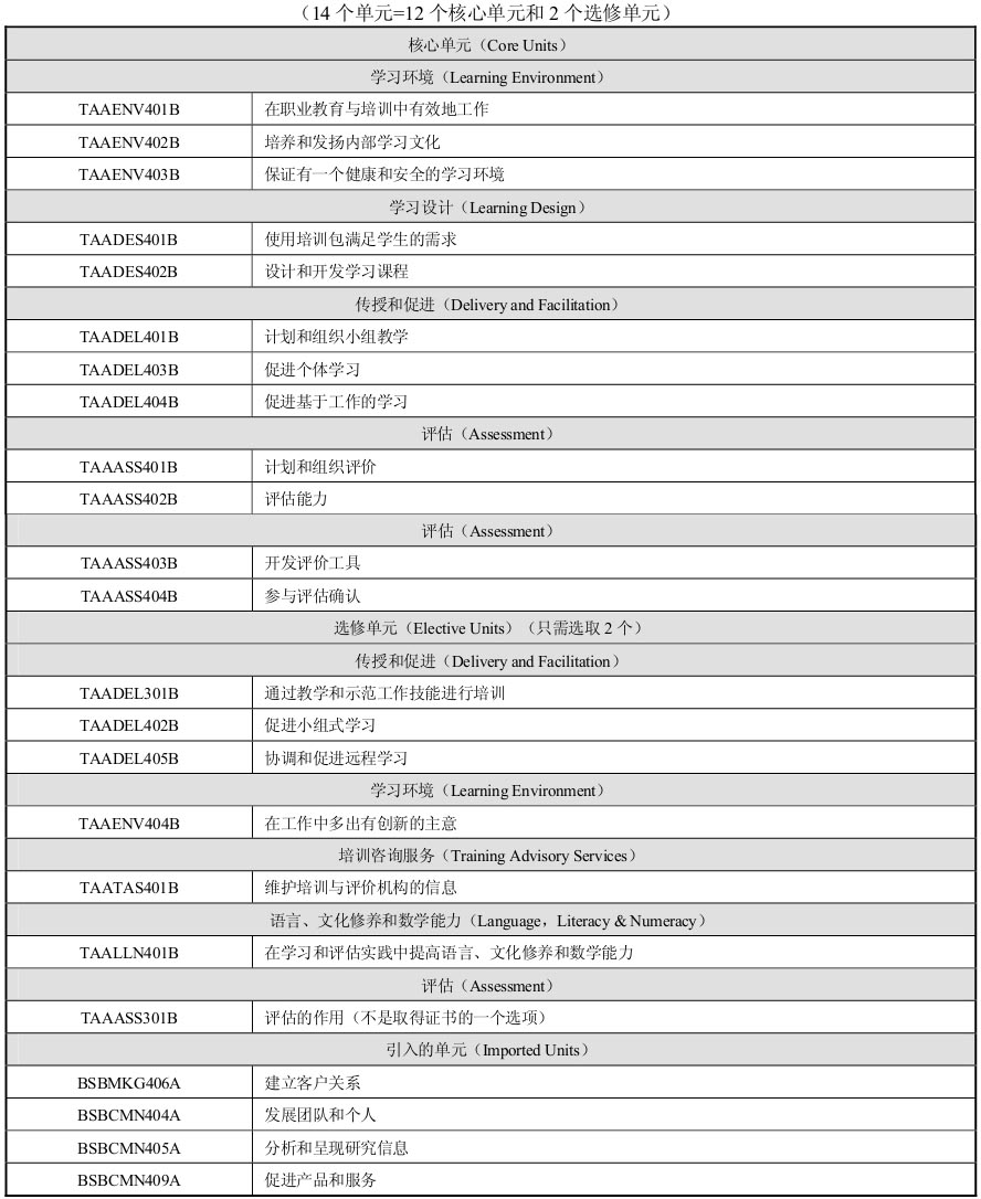这一技能标准的制定,是由澳大利亚“国家行业技能委员会”(National Industry Skills Committee,NISC)完成的。尤其是澳大利亚职业教育的依据——“培训包”三年修订一次的过程中,它发挥着极其关键的作用。“国家行业技能委员会”由雇主和雇员代表组成,主要职责包括:诊断雇主的培训需求、开发培训包,以及向职业教育与培训提供智力支持等。为促进行业企业更好地参与职业教育与培训,澳大利亚政府在2007—2010年提供5100万澳元用于促进“国家行业技能委员会”的建设。目前,澳大利亚已建立11个“国家行业技能委员会”,包括:“农业食品行业技能委员会”、“社区服务及卫生行业技能委员会”、“建筑与物业服务行业技能委员会”、“电子与能源行业技能委员会”、“森林行业技能委员会”、“澳大利亚行政技能委员会”、“创新与商业行业技能委员会”、“制造行业技能委员会”、“服务行业技能委员会”、“资源与基础设施行业技能委员会”和“运输与物流技能委员会”