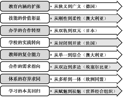 本节的其他案例,比如,英国的教育机构的变迁,但技能目标始终如一;美国生涯与技术教育的目标变化,但观念变化决定指向;俄罗斯的职业教育改革延续传统,英国和澳大利亚的新学徒制温故知新。欧盟的结果导向的课程开发,是“应然”的要求,而德国工作过程导向的课程开发,则是“实然”的途径。