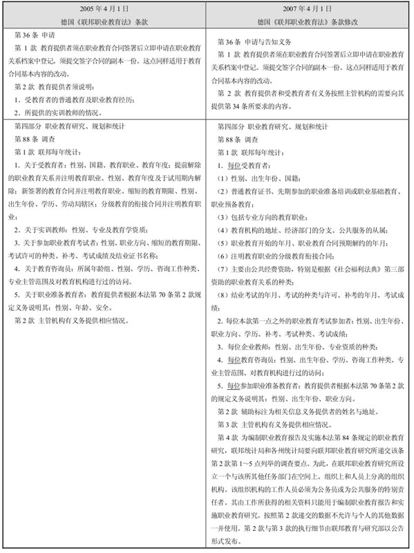 合并,制定新的联邦《职业教育法》。经过充分酝酿,在充分总结和升华前述两部法律实施几十年来的经验和成果的基础上,由联邦政府和联邦议会分别制定的《职业教育法》草案,并于2005年1月27日经德国联邦议会、2005年2月18日联邦参院的表决,通过了综合两个草案优点的总修订方案,并于2005年4月1日颁布实施新的联邦《职业教育法》