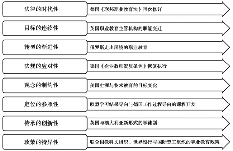 本章对8个案例的描述与分析,从中所梳理出,具有纵横交替的特点,是职业教育的“厚度”,或者说是纵横维度的发展趋势。可以表述为:德国《联邦职业教育法》的再次修订,强调法律的时代性;英国职业教育主管机构的职能变迁,强调目标的连续性;俄罗斯走出困境的职业教育,强调转型的渐进性;德国《企业教师资质条例》的恢复执行,强调法规的应对性;美国生涯与技术教育的目标变化,强调观念的制约性;欧盟学习结果导向与德国工作过程导向的课程开发,强调定位的参照性;英国与澳大利亚新形式的学徒制,强调传承的创新性;联合国教科文组织、世界银行与国际劳工组织的职业教育政策,强调政策的特异性(见图2-80)。