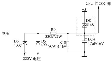 电路分析:电压检测电路如图1-10所示,该电路由二极管 D5、D6、D8、电阻 R9、R10、电容EC4等元器件组成。该电路的作用是电磁炉工作时,时刻检测交流输入电压的变化,并将此电压的变化转换成基准电压加到CPU的28引脚,这时CPU根据28引脚电压的变化,输出相应的动作指令。当电网电压正常时,由D5、D6整流,R9、R10分压,在EC4上形成的基准检测电压在正常范围,CPU检测到此电压输出正常的控制信号;当交流电压过高或过低时,经检测电路在EC4上形成的电压会比正常的检测电压过大或过小,此电压加到CPU的28引脚,CPU根据28引脚电压的变化,输出关机保护指令,保证电磁炉内部元器件不受损坏。