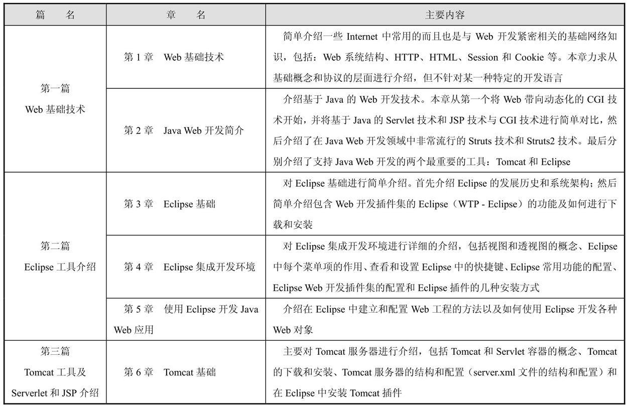 本书从Web开发的基础网络技术谈起,第一篇为基础知识,分别介绍了Web基础技术和Java Web开发基础技术。第二篇介绍了Eclipse的相关知识,具体包括:Eclipse基础、Eclipse集成开发环境以及如何使用Eclipse开发Java Web应用;第三篇介绍了Tomcat工具以及Servlet和JSP技术,具体包括:Tomcat基础、Tomcat中的Web应用、Servlet技术和JSP技术;第四篇介绍了Ant的基础知识以及Ant结构化程序设计理论,具体包括:Ant基础、编写和运行Ant脚本、在Eclipse中使用Ant、Ant主要任务、Ant结构化程序设计元素、Ant结构化程序设计、使用Ant发布Web应用;第五篇介绍了当前最流行的一种Java Web开发框架——Struts2。最后,第六篇通过使用两种不同的技术实现一个简单论坛系统,将本书介绍的技术串联起来给读者一个Java Web开发的全景图。