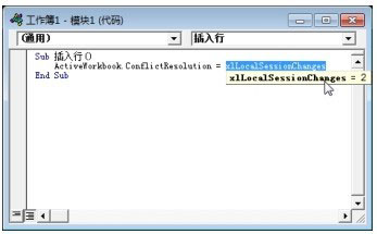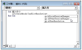 例如:设置更新共享工作簿时解决冲突的方式为“总接受本地用户所做的修改”,就需要将工作簿的ConflictResolution属性设置为常数“xlLocalSessionChanges”。通过常数列表输入的方法如下: