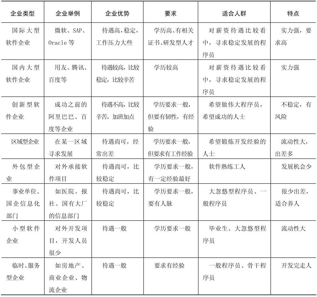 知己知彼,方能百战百胜。下面介绍几类软件企业,如表2.1所示,希望对你的求职有所帮助。