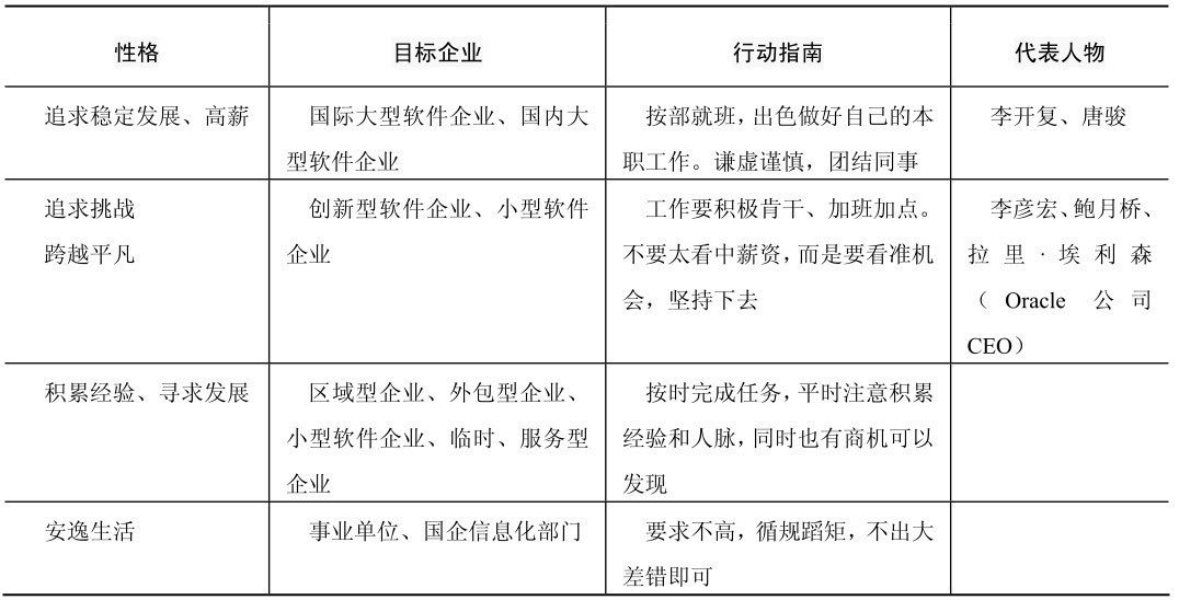 不同的性格和目标,决定走怎样的道路。就像刚出生的小鸟,是成为笼子里不愁温饱的家鸟,还是居于一隅的林鸟,或者长途跋涉的候鸟?这是一个艰难的选择。选择哪类企业,要结合个人性格和职业目标。表2.2给出了个人性格和职业目标的建议。