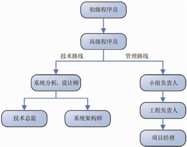 这也是大部分程序员的成长路线。当程序员到达高级程序员后,向管理方面转变,经开发小组负责人、工程负责人,奋斗到项目经理。这种路线适合有一定沟通能力和协调能力的人。走向管理岗位并不是放弃编程,项目经理会在宏观上调控项目的进行,而不像程序员那样注重于程序的细节和功能点。