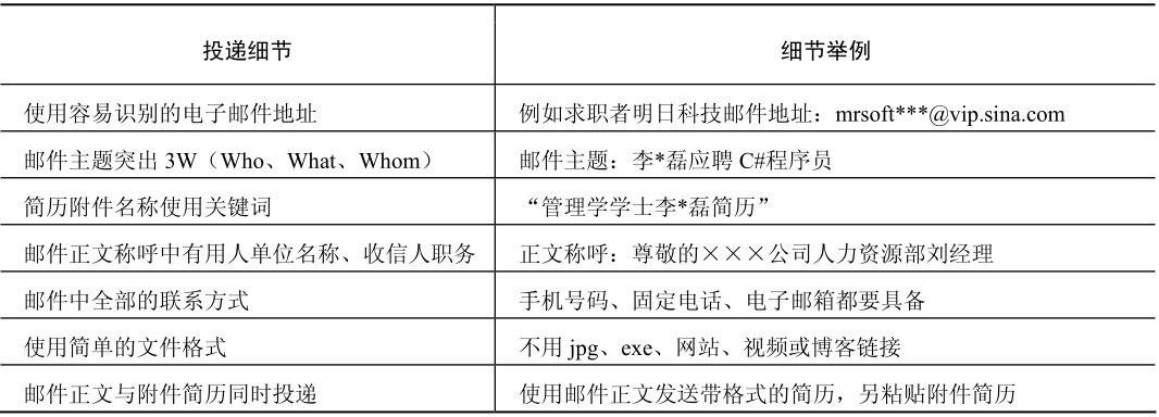 随着互联网的普及,使用电子邮件投递简历越来越普遍。使用电子邮件投递简历需要注意几个方面的细节,具体说明如表4.2所示。
