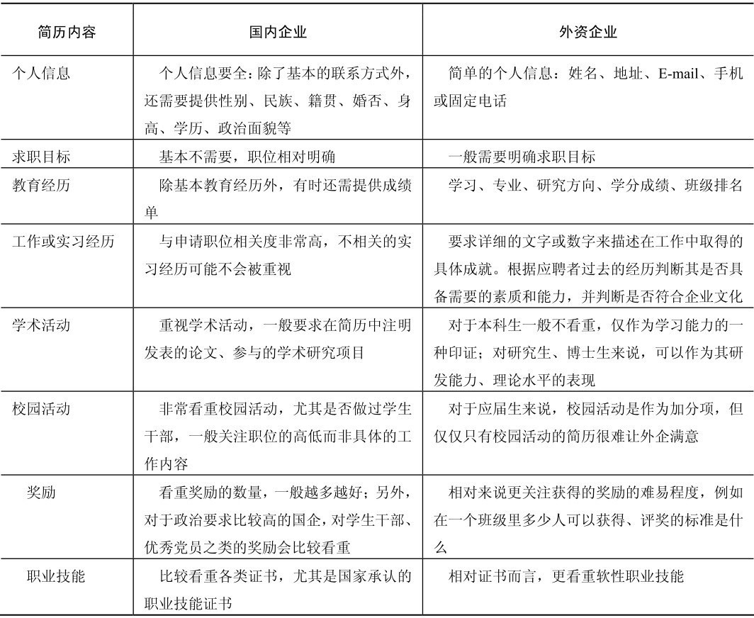 不同类型的企业,简历筛选的标准也不同。表4.3是关于国内企业、外资企业简历筛选的分析,希望对求职者有所帮助。