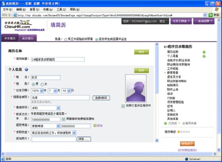 图5.10 中华英才网的填写简历页面
