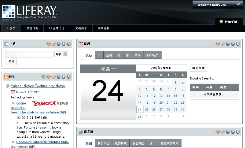 Liferay Portal是一套相当成熟的、功能强大的企业级集成应用系统。Liferay Portal作为一个开源的Portal产品,提供了对多个独立系统的内容集成,可以帮助一个企业各个组织(社区)实现更有效的合作。图0-1就是用Liferay自建网站的首页。