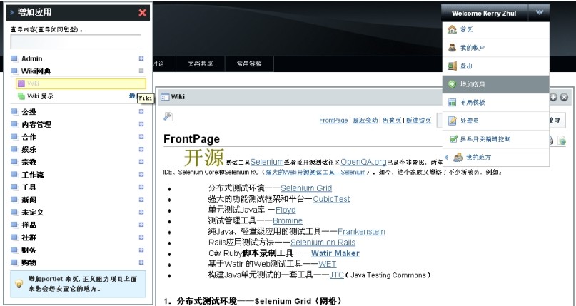 LifeRay的功能也很强大,不仅可以支持标准Portal所支持的功能,而且支持国际化(I18N)和包括中文在内的多种语言、支持各种远程信息的获取,可使用Apahce Lucene实现全文检索功能,并已有大量的应用组件,如wiki、RSS、博客、工作流、投票和许多工具等,如图0-2所示。