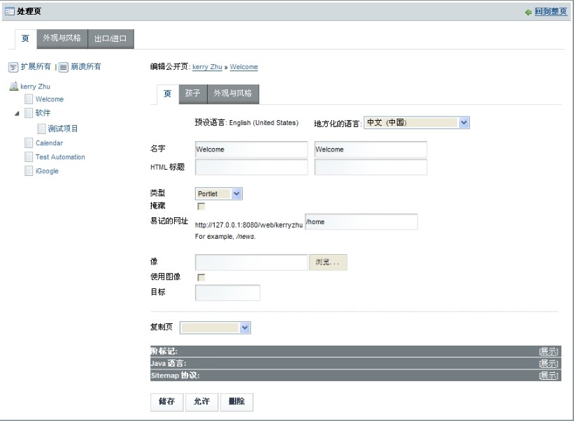 对网页进行配置处理,配置网页的类型、外观与风格(Look and Feel)、访问权限、子网页和网页排列顺序等。在外观与风格中的“规则浏览器”是指普通电脑的浏览器,因为Liferay Portal可以向手机和PDA等移动上网设备提供服务。Liferay Portal的网页定义了6种类型。