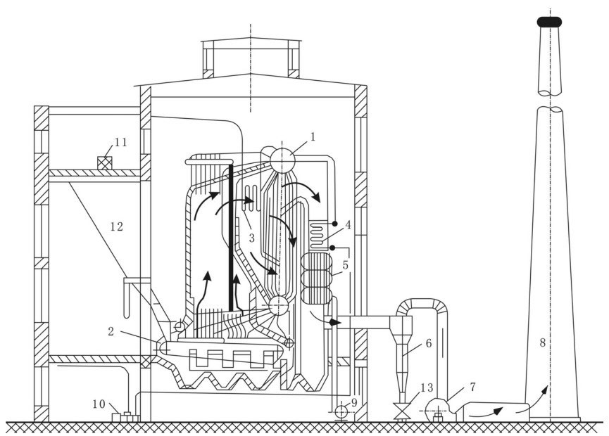 1.锅筒 2.链条炉排 3.过热器 4.省煤器 5.空气预热器 6.除尘器 7.引风机 8.烟囱 9.送风机 10.给水泵 11.输煤皮带 12.煤粉仓 13.锁气器