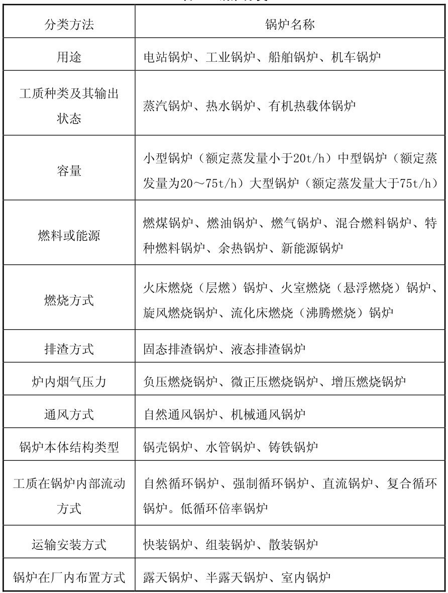 表2-1 锅炉分类