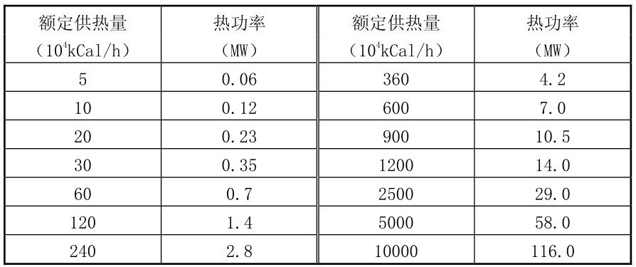 按上面公式换算,当锅炉的额定供热量为60×104kCal/h,其热功率相当于0.6978MW,取近似值为0.7MW。额定供热量与额定热功率的换算关系见表2-2。