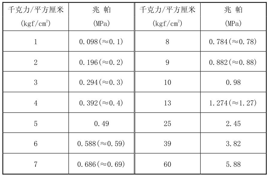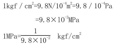 帕(Pa)是我国的法定计量单位,由于帕(Pa)的单位太小,在锅炉参数中压力常用兆帕(MPa)表示。过去习惯上用kgf/cm2表示,因为1kgf=9.8N,1m2=10000cm2,则二者可以如此换算: