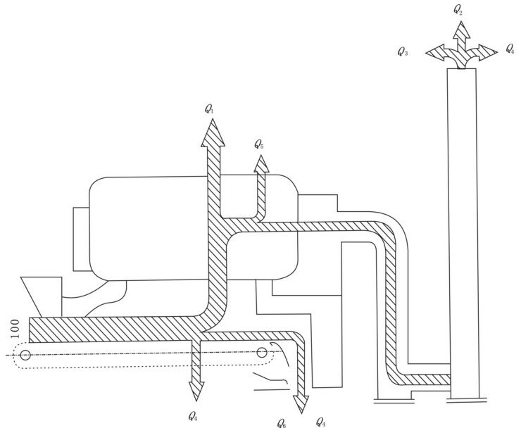 Q1—有效利用的热量 Q2—排烟热损失 Q3—气体未完全燃烧热损失Q4—固体未完全燃烧热损失 Q5—散热损失 Q6—灰渣物理热损失