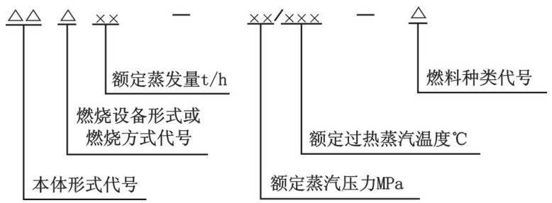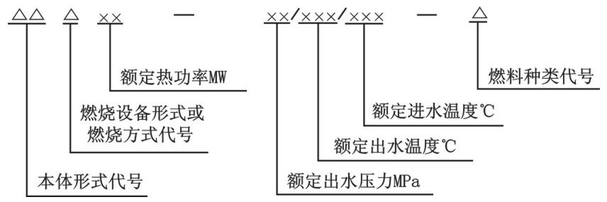 型号的第二部分表示介质参数。对蒸汽锅炉分两段,中间以斜线相连,第一段用阿拉伯数字表示额定蒸汽压力为若干“MPa”;第二段用阿拉伯数字表示过热蒸汽温度为若干“℃”,蒸汽温度为饱和温度时,型号的第二部分无斜线和第二段。对热水锅炉分三段,中间以斜线相连,第一段用阿拉伯数字表示额定出水压力为若干“MPa”;第二段、第三段分别用阿拉伯数字表示额定出水温度和额定进水温度为若干“℃”。