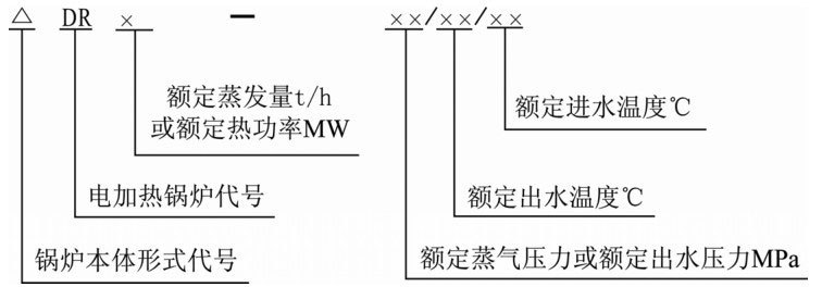 型号的第一部分表示锅炉本体形式和电加热锅炉代号及锅炉容量。共分3段,第一段用一个大写汉语拼音字母表示锅炉本体形式,锅炉本体形式分卧式和立式两种,用W代表卧式,用L代表立式;第二段用两个大写汉语拼音字母DR表示电加热锅炉代号;第三段用阿拉伯数字表示蒸气锅炉的额定蒸发量为若干“t/h”或热水锅炉的额定热功率为若干“MW”。各段连续书写。