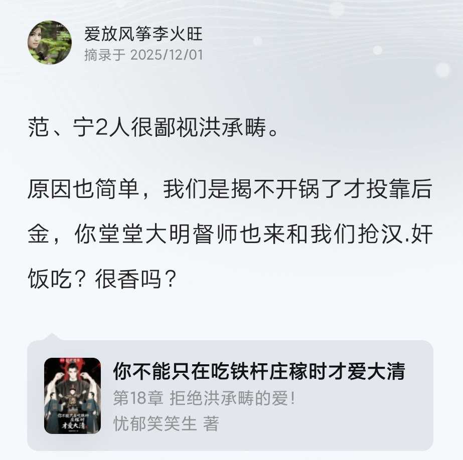 贾队长高见,卖国还整出鄙视链来了,宁完我、范文程、洪承畴不过是五十步笑百步,彼此彼此罢了。