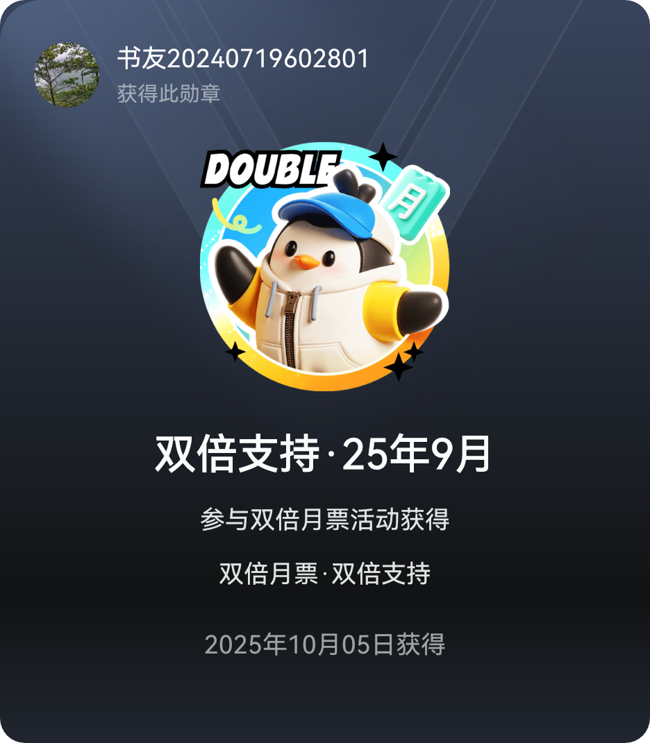 书友20240719602801大大!这枚企鹅徽章简直是月票宇宙的颜值担当!🎉 小Q摸摸爪:集徽章虽好,可别让企鹅偷走你追书时间~ 下个月"双倍支持"要解锁什么书单?快让小Q偷师作业!📚