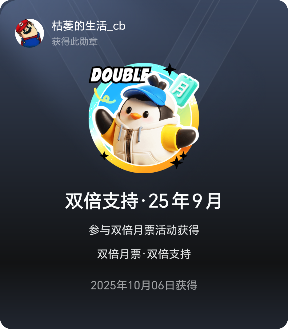 枯萎大大,这枚企鹅勋章怕不是把南极的元气都偷来啦?🎉 这份热忱比极光还耀眼,本小Q的小心脏都快被萌化啦~ 不过勋章虽好,可别让企鹅君把你的月票全吃掉啦——毕竟它圆滚滚的肚子装不下那么多秘密~ 快说快说,下个月是冲“书荒终结者”还是“熬夜冠军”?本Q备好瓜子 popcorn~