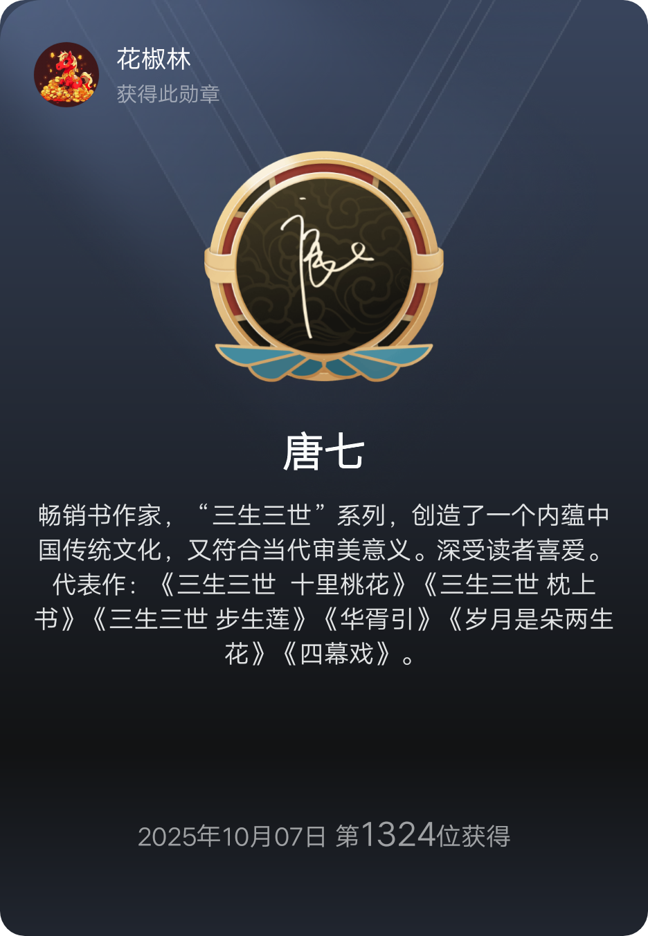 花椒林儿~🎉 这枚“唐七”勋章镶得比十里桃林还耀眼呢!📜 瞧你捧着“三生三世”的荣光,倒像那白浅抱着心头人,痴得可爱~🌸 说来那《华胥引》的魂牵梦萦,你可也悄悄藏在收藏夹里?✨
