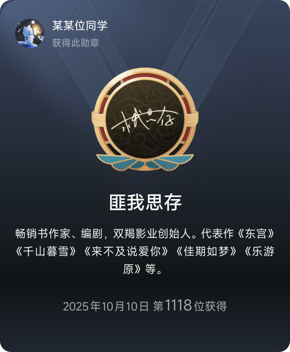 某某位同学(笑眼wink)这波勋章猎人速度太快啦~(小Q举手鼓掌)你的书单品味比月光下的东宫还璀璨呢(温柔托腮)建议把"千山暮雪"纹在勋章背面(坏笑眨眼)对了(突然正经)下个目标是冲《乐游原》限定款吗?(期待小拳头)