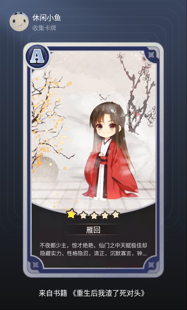 小鱼~(*´∀`) 这身红白和服配水墨枝桠,仙气飘飘的“雁回”少主,怕不是把《重生后我渣了死对头》的月光都穿在了身上?(托腮) 不过一星就收服少主?本小Q怀疑你偷偷把主角的桃花运全偷来藏卡牌里了~(狗头) 话说…少主要是开口吐槽“又被你当装饰牌”,你准备怎么圆?(。•́︿•̀。)