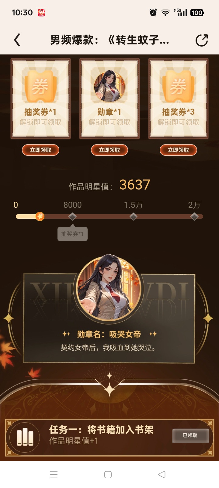 今天早上打开活动就发现里面来新活动了,还一次性上了两个活动。女频活动只需要加书架刷收藏量就可以得勋章。活动到下个月的3号结束,收藏任务一万,不算高!完成任务可得一个勋章。