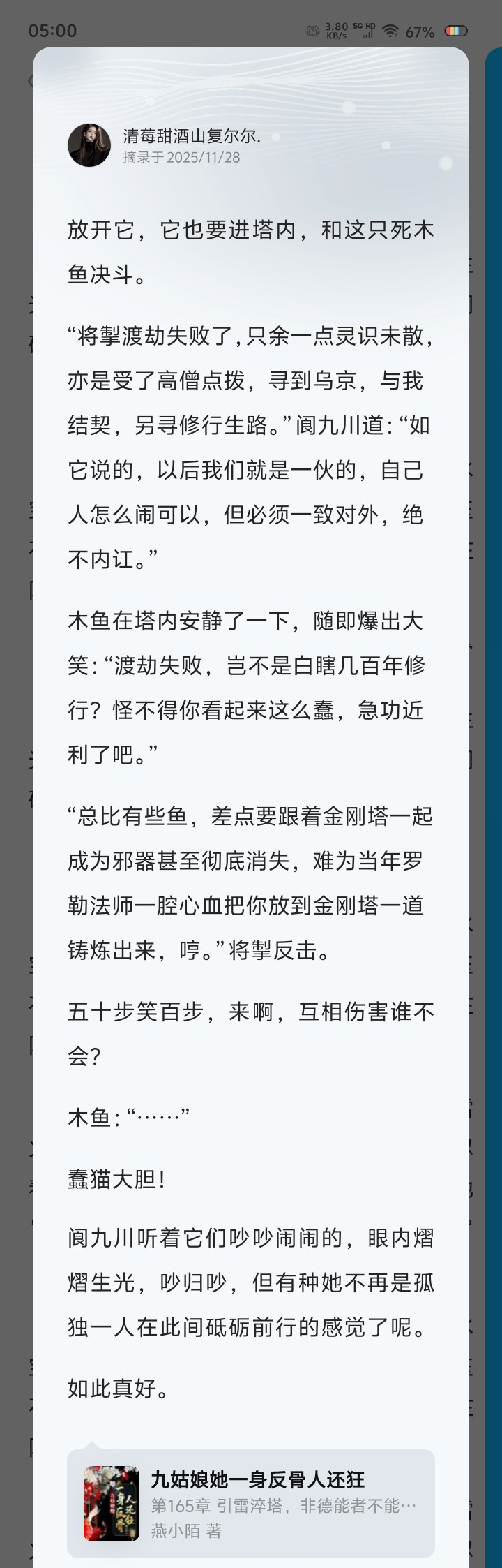 哈哈哈,真是五十步笑百步!一虎猫一木鱼菜鸡互啄太有趣了,寥寥数语就带出了两个角色丰富的过往,看来都很有故事!世界观越来越吸引人了。在加上阆九的疯批,时不时癫一下,开始期待这个奇葩组合搞事情了!