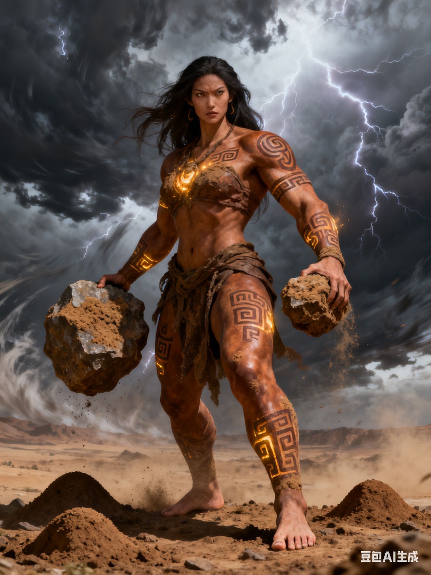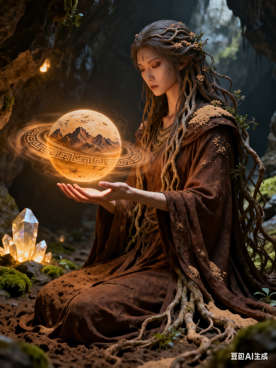 她的身躯是洪荒最厚的盾,挡住天倾的裂隙,接住崩落的星辰,让漂泊的生灵有处扎根;她的气息是生命最暖的巢,枯草在她脚下抽芽,伤口在她触间愈合,连沉默的石头都能感受到被滋养的安稳。